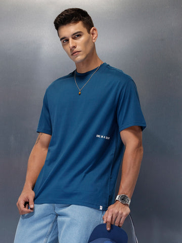 A teal oversized t-shirt featuring a clean, minimal print for understated cool. Designed for comfort and style, it pairs effortlessly with jeans or cargo joggers.