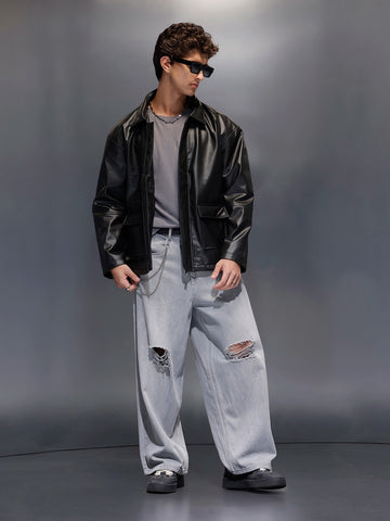 Men's Relaxed Fit Collared Fit PU Jacket | Black
